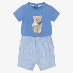 Girls white and pink floral shorts set by Lapin House, ideal for sunny days. The set is made in soft, comfortable jersey, with an eye-catching, glittery silver 'B' on the T-shirt, striped in pink with pretty flowers and a butterfly. There are pink, seersucker bows across the shoulders and the hemline is ruffled around the back. The coordinating shorts have a comfortable, frilled and elasticated waistband. Both pieces are easy to wear, being pull-on in style.