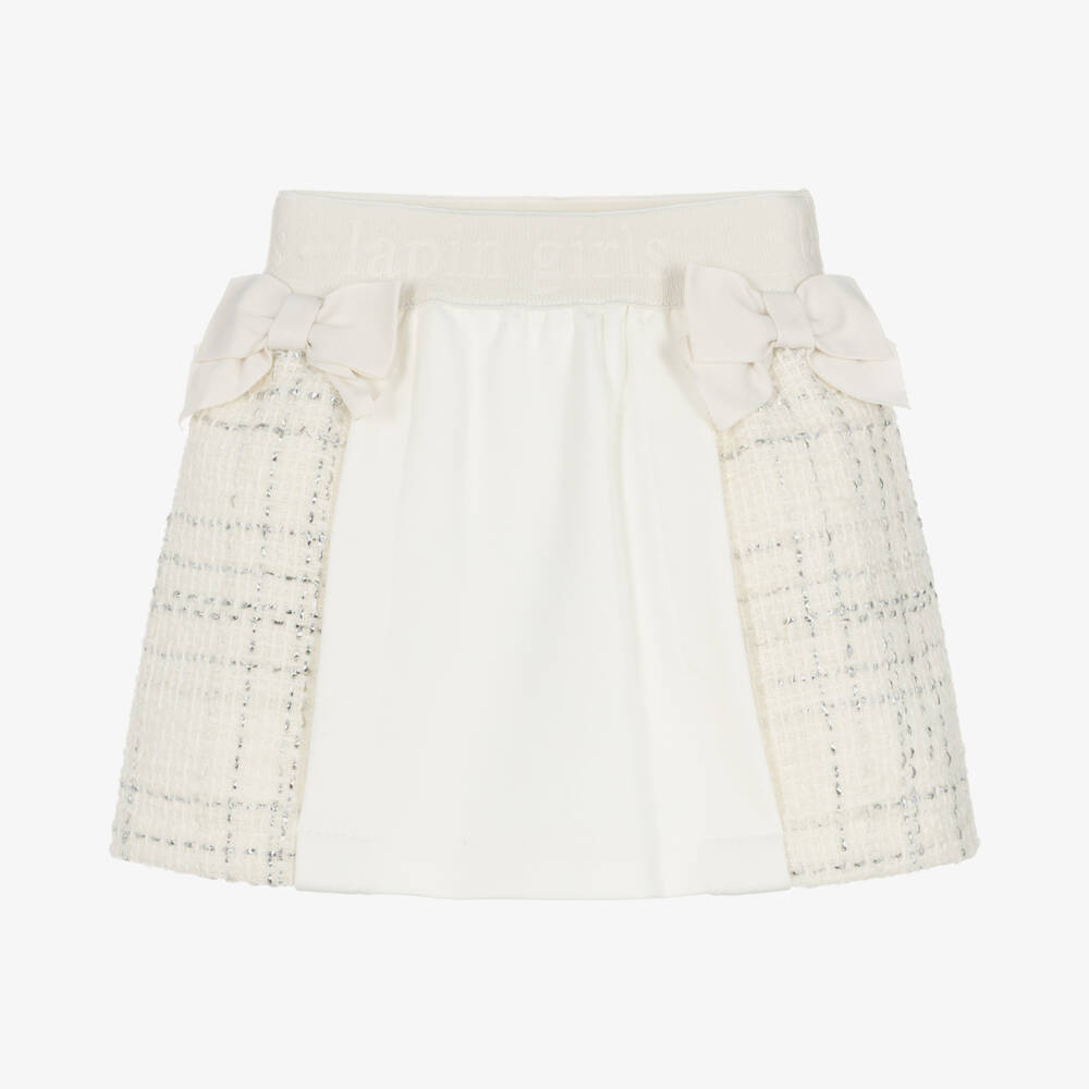 Ivory skirt for girls by Lapin House, woven in soft tweed with metallic silver thread for extra sparkle. Fully lined with lightweight cotton, this skirt combines comfort and style with a jersey panel on the front and decorative grosgrain bows on the waistline. Easy to pull on, the elasticated waistband is woven with the designer's name for a branded finish.