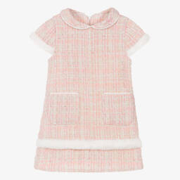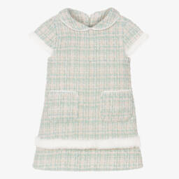 This mint green dress by Lapin House is a charming choice for girls. Made in soft tweed woven with glittery silver thread for a touch of sparkle, it has a sweet Peter Pan collar and faux fur trims on the short sleeves and hem. It has a soft cotton lining, front patch pockets and a concealed zip fastening on the back for a neat finish.