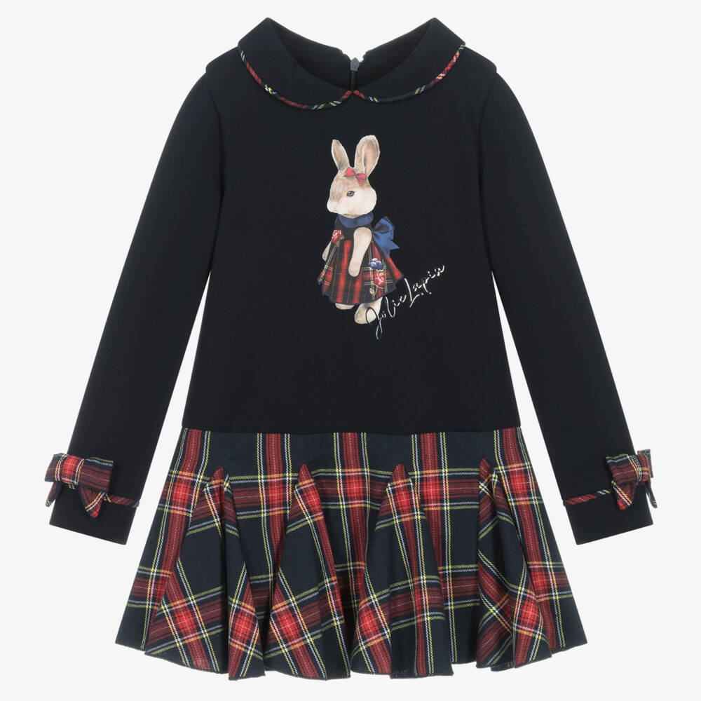 A sweet navy blue dress for girls by Lapin House, made in a soft cotton blend. The long-sleeved, jersey bodice has a Peter Pan collar and a cute bunny rabbit graphic printed on the front. Tartan bows and neat piping trims can be seen on the cuffs and around the collar to match the ruffled, twill skirt. Lined with lightweight cotton, this easy-to-wear dress fastens with a zip on the back for a good fit.