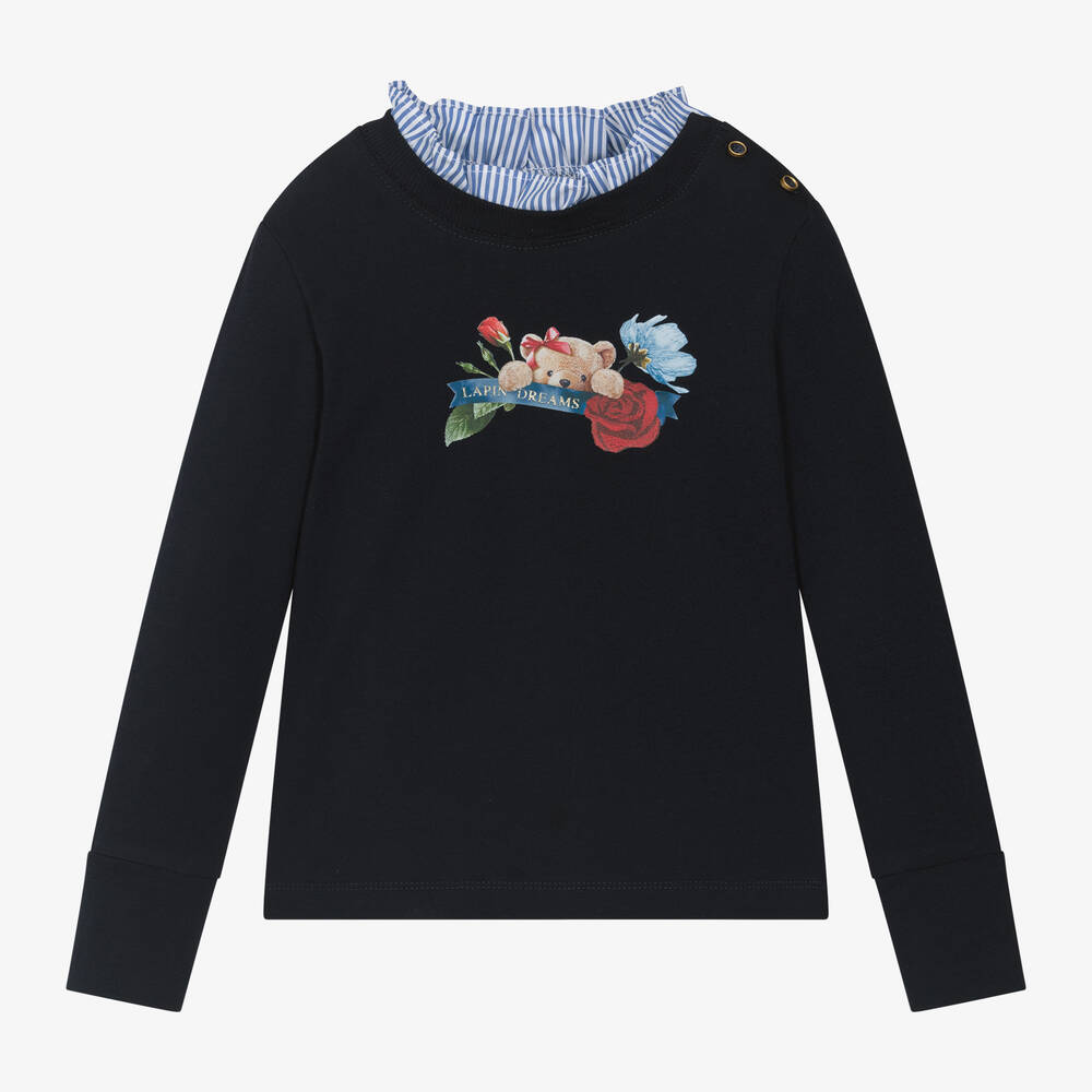 Girls navy blue top by Lapin House, made in soft and stretchy cotton jersey. It has long sleeves with gently ribbed cuffs and gold-edged buttons on the shoulder. The ribbed neckline has a blue and white striped collar attached for a layered shirt look. On the front, is a cute teddy bear and flower print.