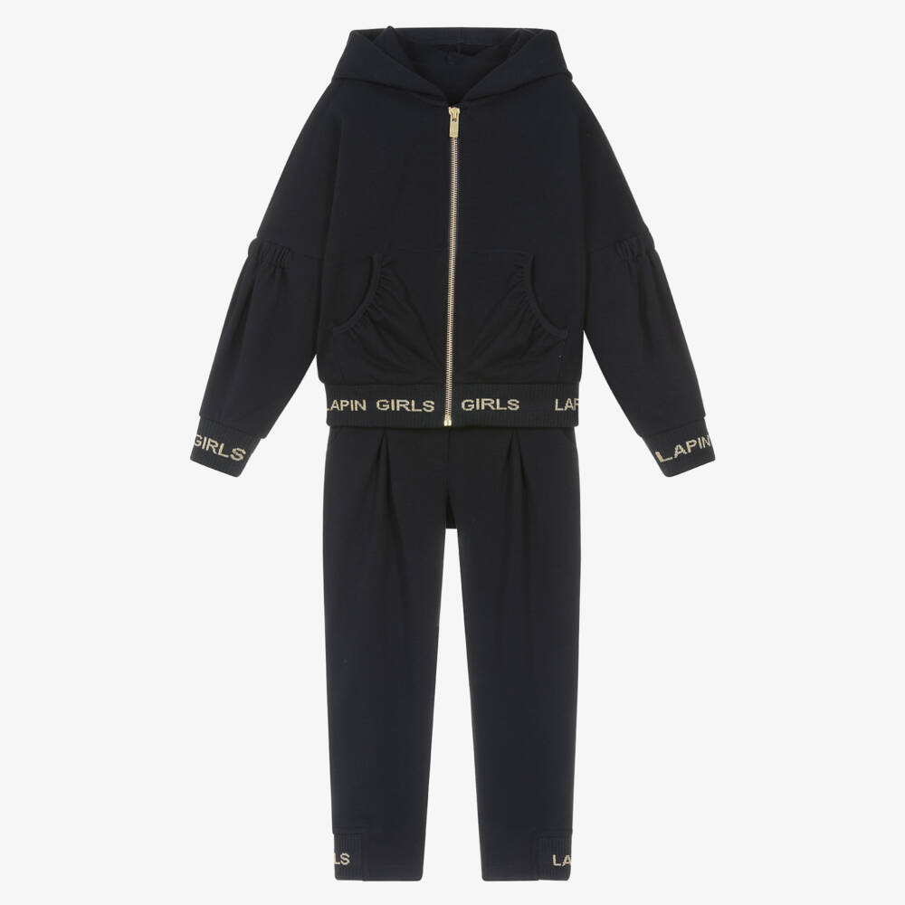 A navy blue cotton tracksuit for girls by Lapin House, made from super soft mid-weight jersey. Stunning on casual days, the cosy hooded top fastens with a shiny gold zip and has a glittery gold logo interwoven in the trims. The pockets are lightly ruched, whilst the sleeves have elasticated decorations for stylish yet casual wear. It pairs effortlessly with the matching joggers, which have side seam pockets and are finished with light pleats.