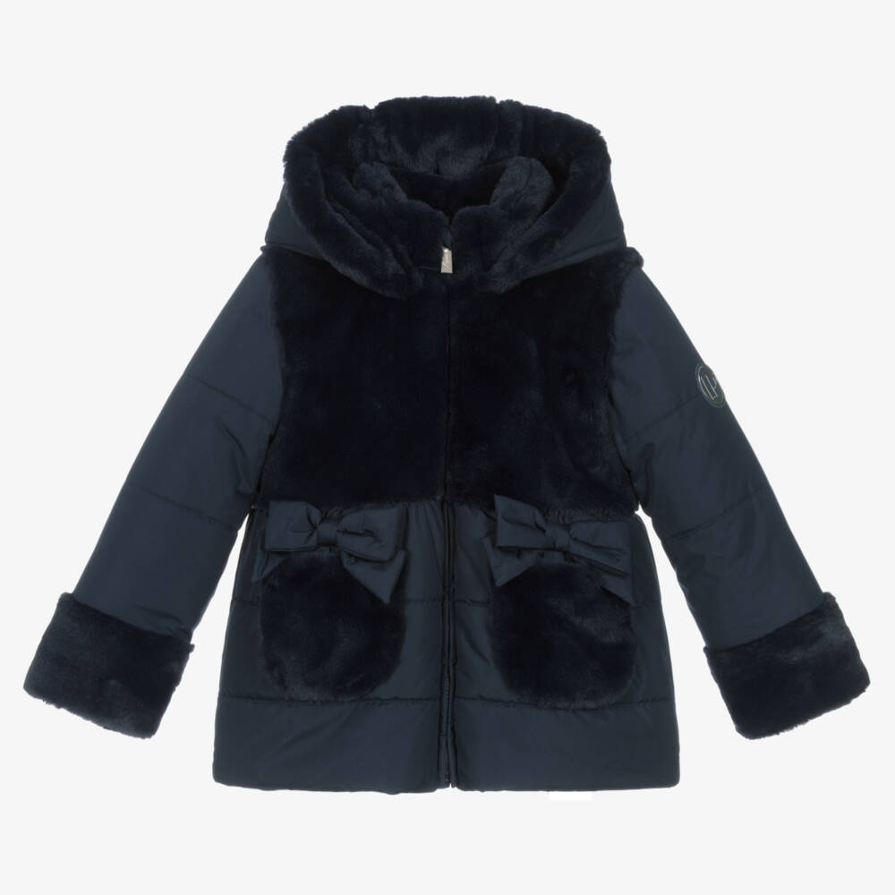 Navy blue zip-up coat for girls by Lapin House. Made in a soft, smooth fabric, it has lovely plush faux fur trims on the front, hood and cuffs and pretty bows above the front pockets. Padded for warmth, it has a quilted lining and an internal adjustable waist for a preferred fit. The hood is fully detachable, securing with concealed buttons around the neckline.