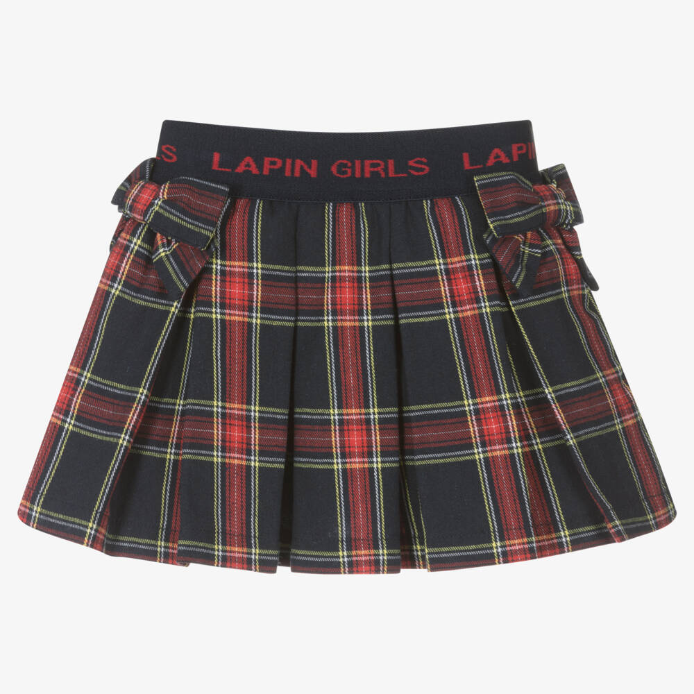 Navy blue and red cotton skirt for girls from Lapin House. This box-pleated skirt is woven in soft twill, with a red, white and yellow tartan pattern for a classic look. Super comfortable, the skirt has a lightweight cotton voile lining and a gently elasticated waist, with the label's jacquard branding in complementary blue and red. Lovely tartan bows decorate the sides to complete this feminine style.