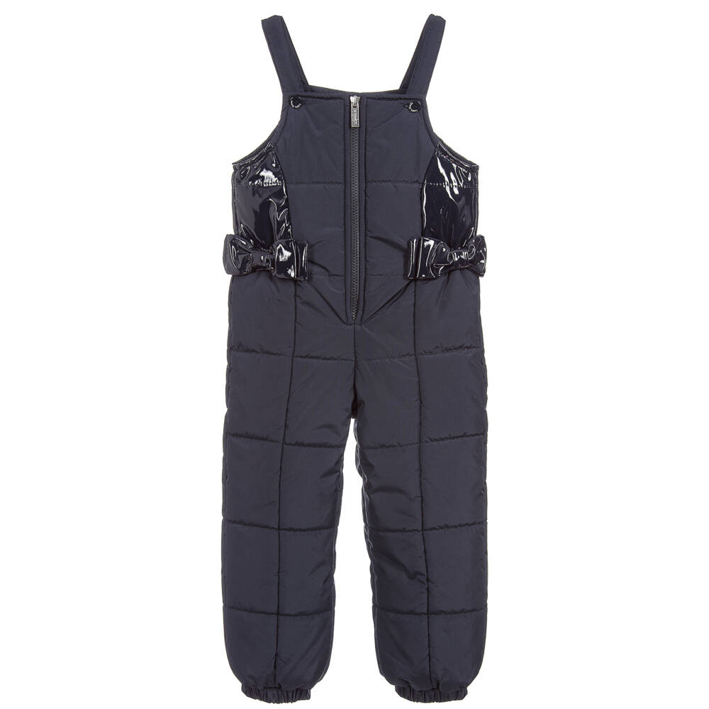 Navy blue salopettes by Lapin House with vinyl panels and bows on the sides. These waterproof outdoor dungarees are padded, lined in cotton and fasten with a zip.