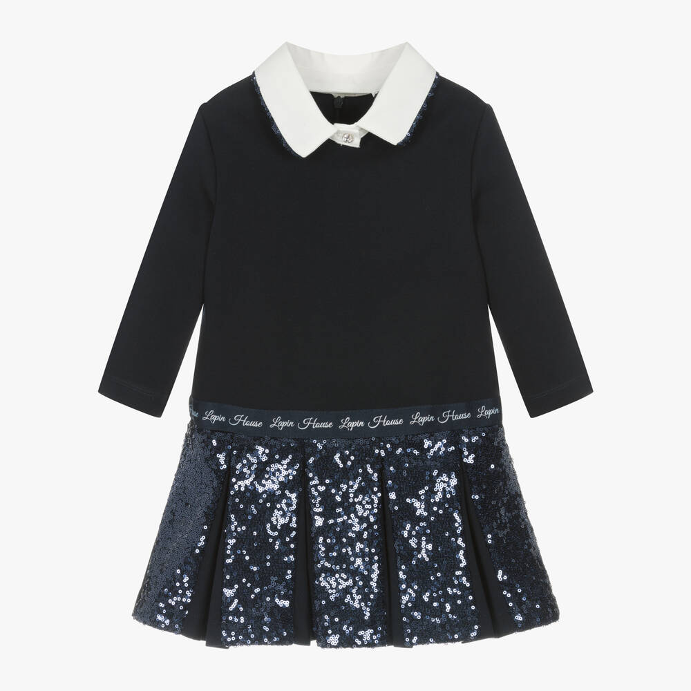 Girls navy blue dress by Greek brand Lapin House, made in a soft and stretchy viscose blend. The jersey bodice has long sleeves and a detachable white twill collar that fastens inside the neckline with discreet buttons. The dropped waist has a branded grosgrain trim and the pleated skirt has sequin panels that sparkle beautifully in the light. This mid-weight dress is lined in lightweight cotton fabric and fastens on the back with a zip.