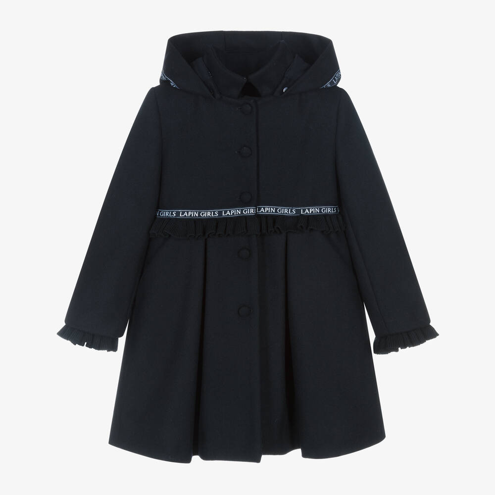A smart navy blue hooded coat for girls by Lapin House, made in a luxuriously cosy felted wool blend. Trimmed with knitted ruffles and glittery logo tape, this stylish design has a stand-up collar, slanted front pockets and covered button fastenings. The skirt is pleated for a charming silhouette and the coat is comfortably lined in lightweight cotton. The hood attaches with buttons and can be removed for an alternative look.