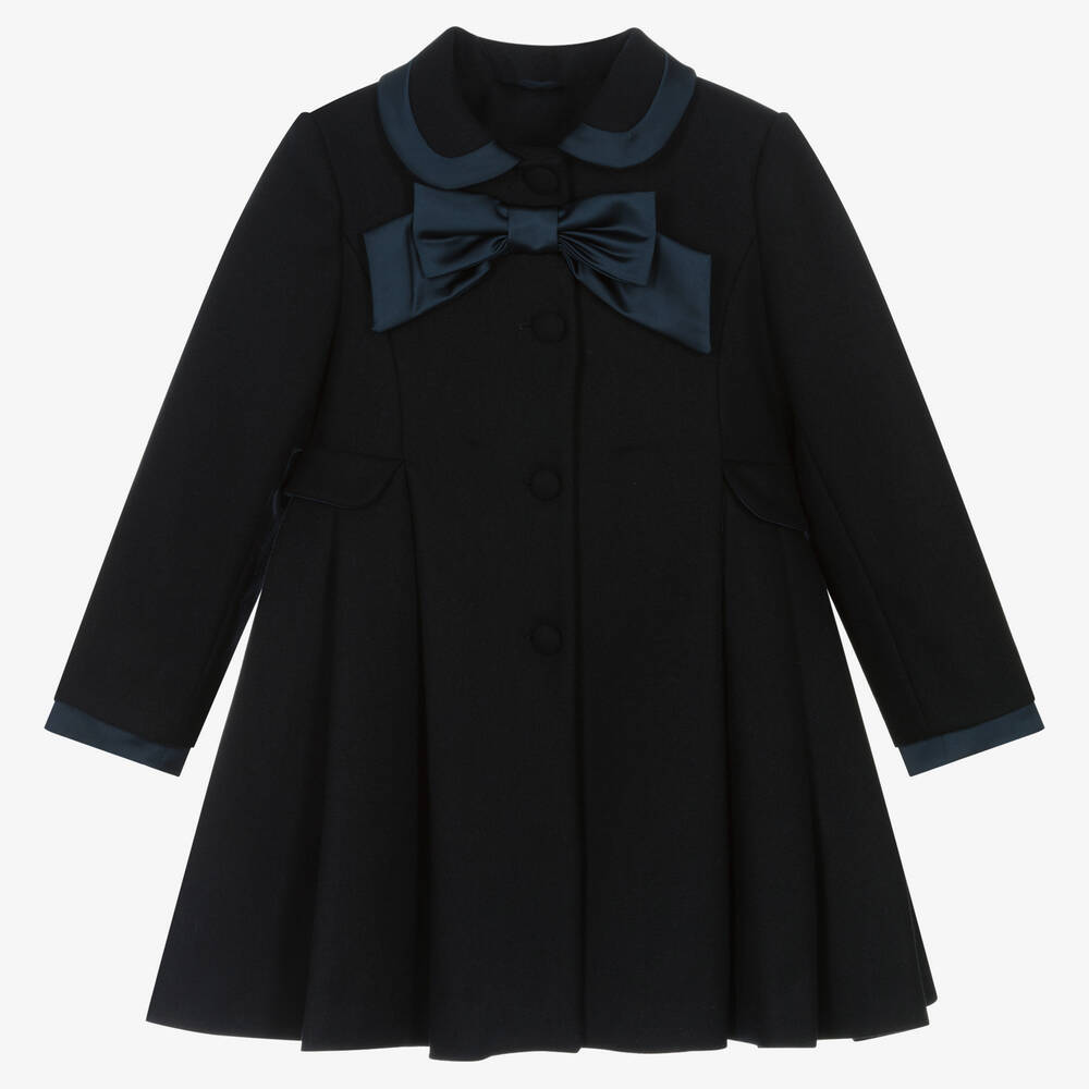 Beautiful navy blue coat for girls by Lapin House, made in a lovely soft wool blend with a touch of luxurious cashmere. Traditionally styled, it has gorgeous satin trims on the rounded collar and inside the cuffs. Pleated around the skirt, it has faux pockets and a lovely satin bow across the front. It has a lightweight lining for comfort and button fastenings on the front.