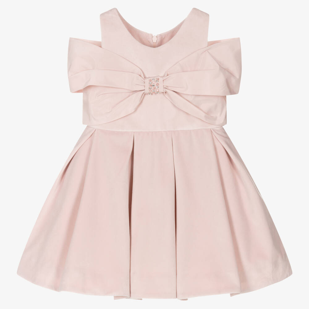 A cute pale pink dress for girls by Lapin House, woven from beautifully soft velvet. In an elegant open-shoulder design, this dress has a large diamanté detailed bow across the front, with delicate pleats falling down the skirt. It fastens neatly with a concealed zip and has a lightweight lining for a supreme finish.