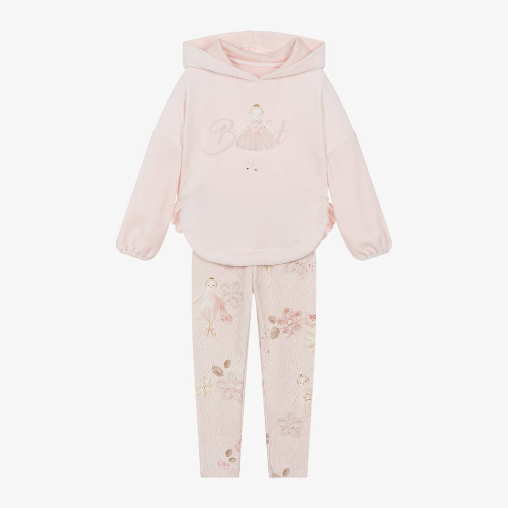 Lovely pink ballet-themed leggings set for girls by Lapin House. Made in beautifully soft velour, the hoodie has dropped shoulders and a sweet ballerina print on the front, with a tulle tutu skirt. The shaped hemline has a ruffle trim around the back for a pretty finish. To complete the look, the comfortable jersey leggings have a knit effect pattern featuring ballerinas and flowers.