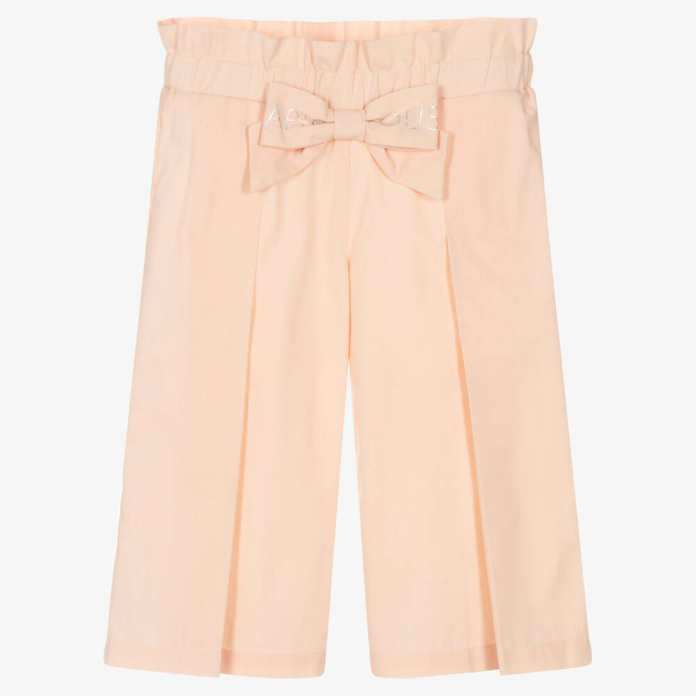 Smart-casual pink trousers for girls by Lapin House, made in lightweight, linen-look cotton. Cropped in style, they have wide legs with a central pleat and a large, fixed bow on the front, printed with a shiny silver logo. Just right for all-day comfort, they have an elasticated waistband with a pretty frilled trim.