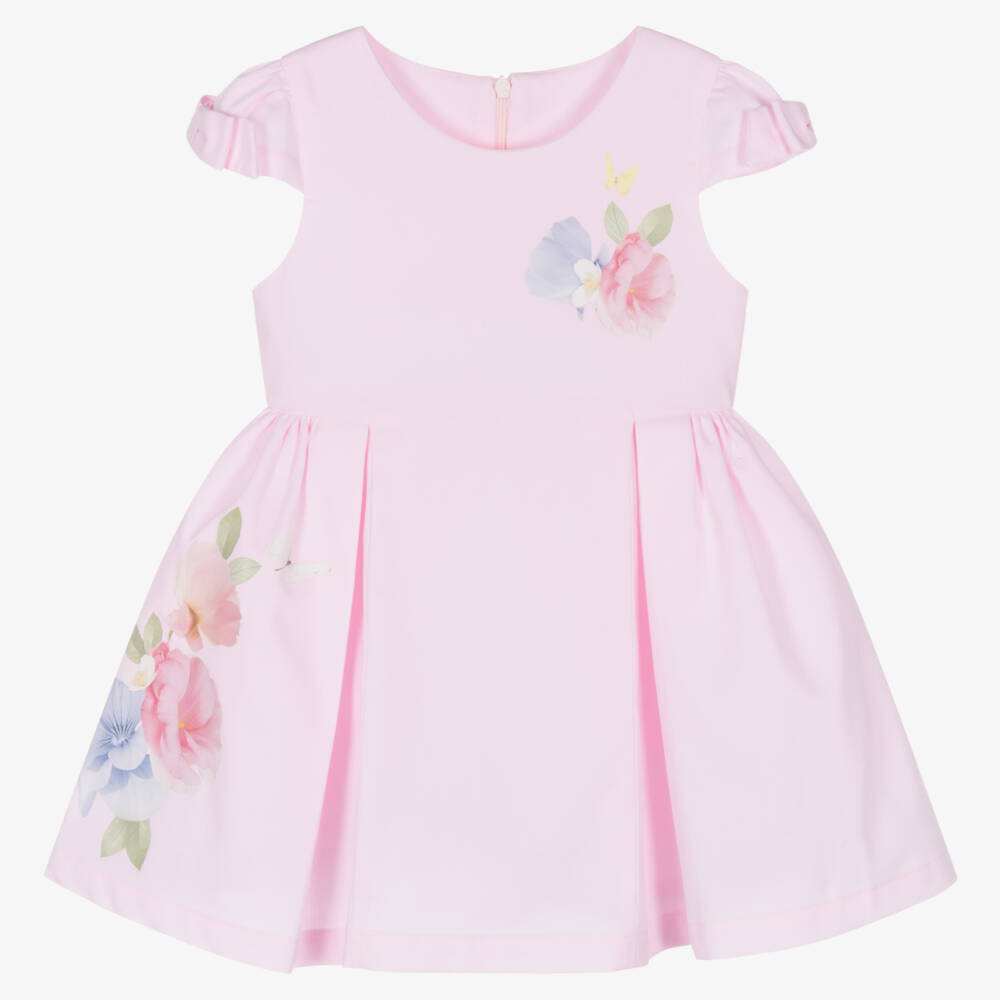 Pretty pink dress for girls by Lapin House, made in soft, finely ribbed cotton with a lightweight lining. It has colourful floral butterfly print on the bodice and side of the skirt. There are cute fixed bow trims on the capped sleeves, with inverted pleats on the front of the skirt. It has a concealed zip fastening on the back.