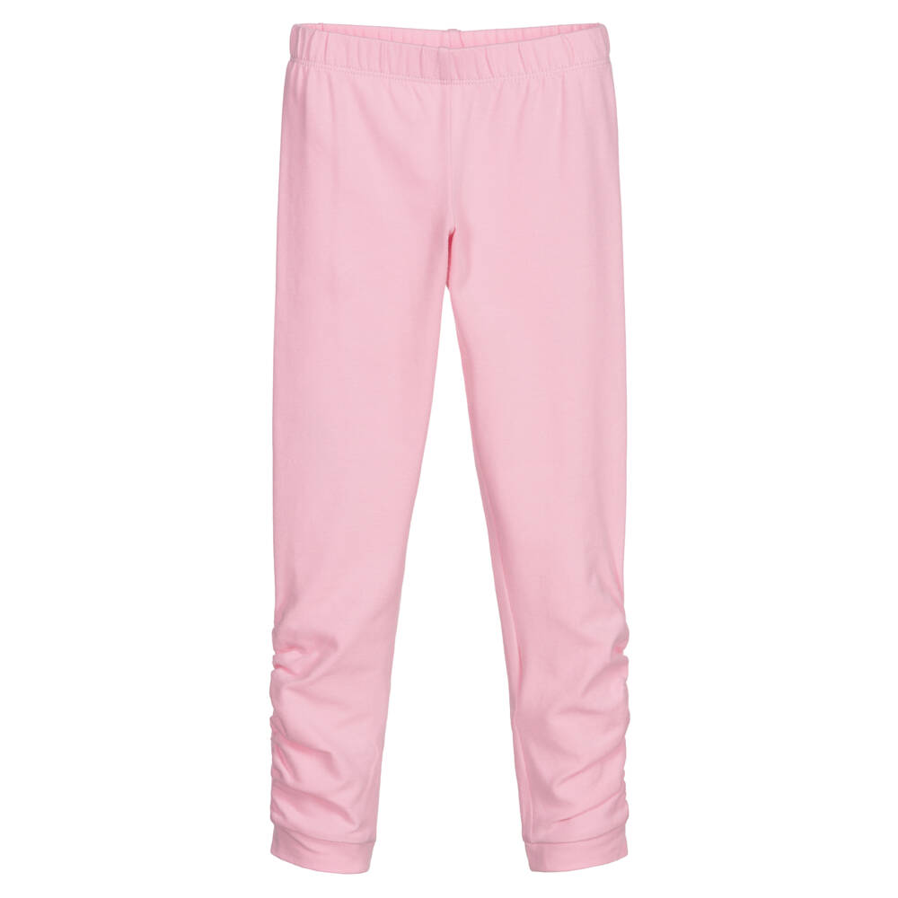 Girls pink leggings by Lapin House, made in soft and stretchy cotton jersey. They are full length and have ruching on the sides of the lower leg.