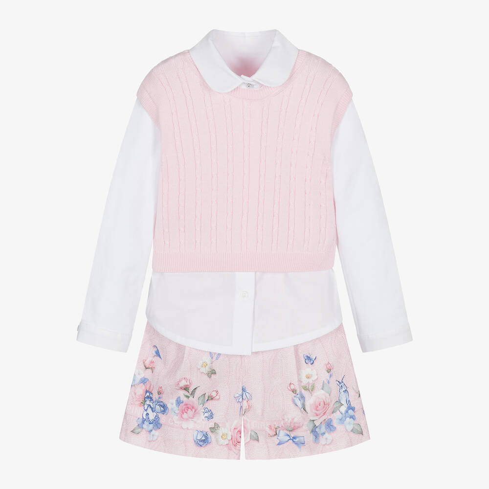 Pretty pink cotton shorts set for girls by Lapin House, ideal for a smart-casual look. The white blouse fastens with buttons on the front and sparkly, diamante buttons on the cuffs. It comes with a pink, cable-knit tank top for layering. The cotton shorts have a coordinating cable knit pattern, along with flowers and sweet animals. It is pleated, with a semi-elasticated waistband for comfort and a discreet side zip fastening.