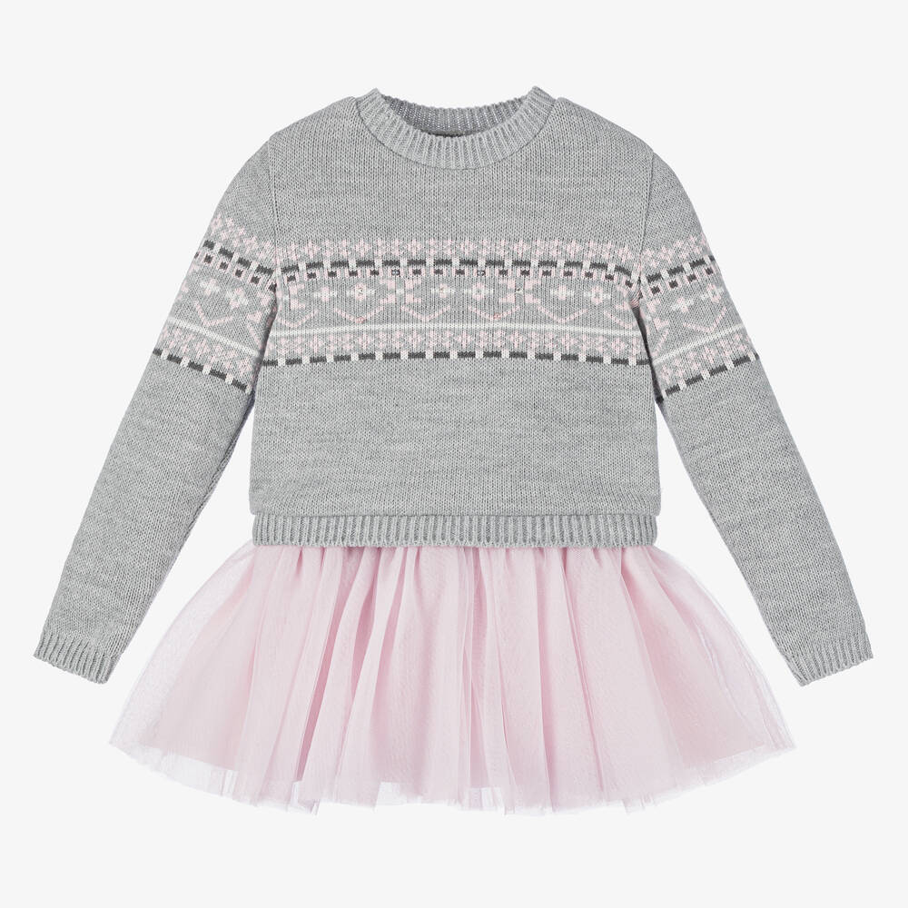 A lovely pink dress and grey sweater set for girls by Lapin House. The sleeveless dress is made in soft cotton jersey, with a full gathered skirt made with layers of sparkly tulle. Adding a cosy extra layer, the dress comes with a softly knitted sweater, which has a pink and grey pattern across the front, embellished with sparkly diamanté and faux pearls.