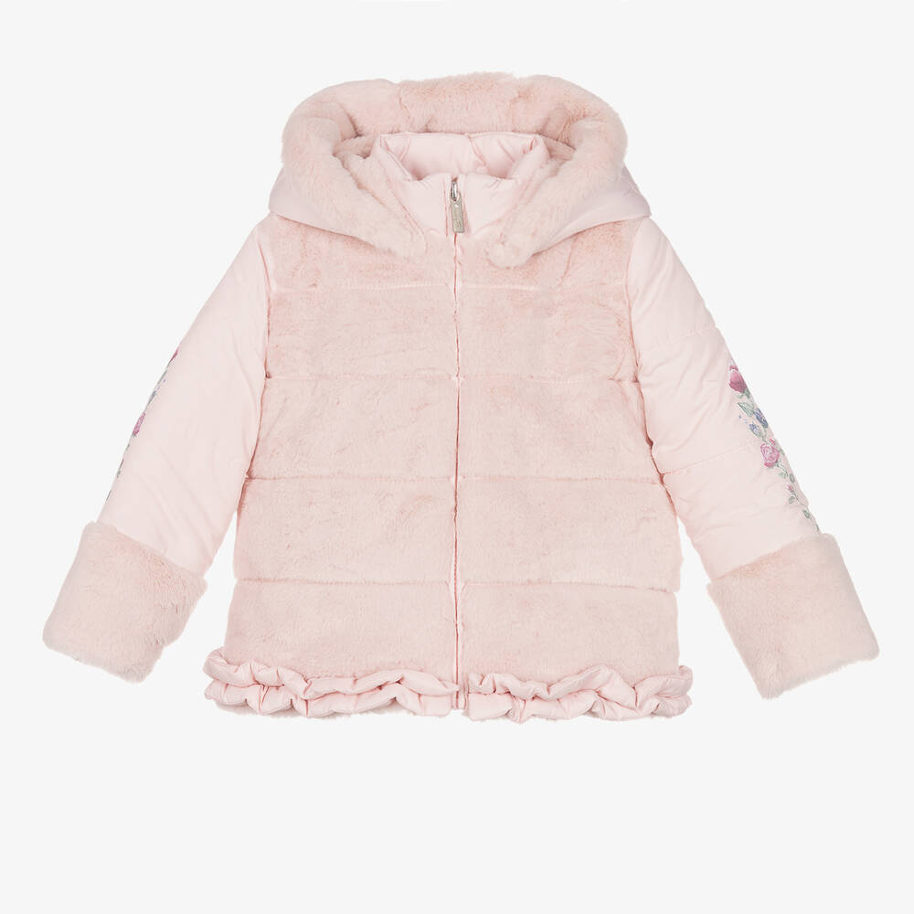 Lovely pink coat for girls by Lapin House. Made in a soft, smooth fabric, it has lovely plush faux fur trims on the front, hood and cuffs. There are pretty floral prints on each sleeve, a ruffle hem and ribbed cuffs for extra warmth. Lightly padded, with a quilted lining, it has an internal adjustable waist for a snug and cosy fit. The hood is removable, attaching with buttons and there is a concealed zip fastening on the front.