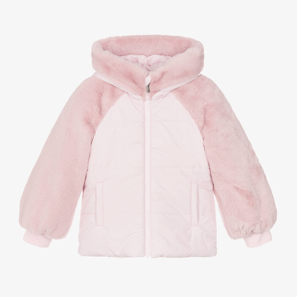 Girls Pink Faux Fur Hooded Jacket