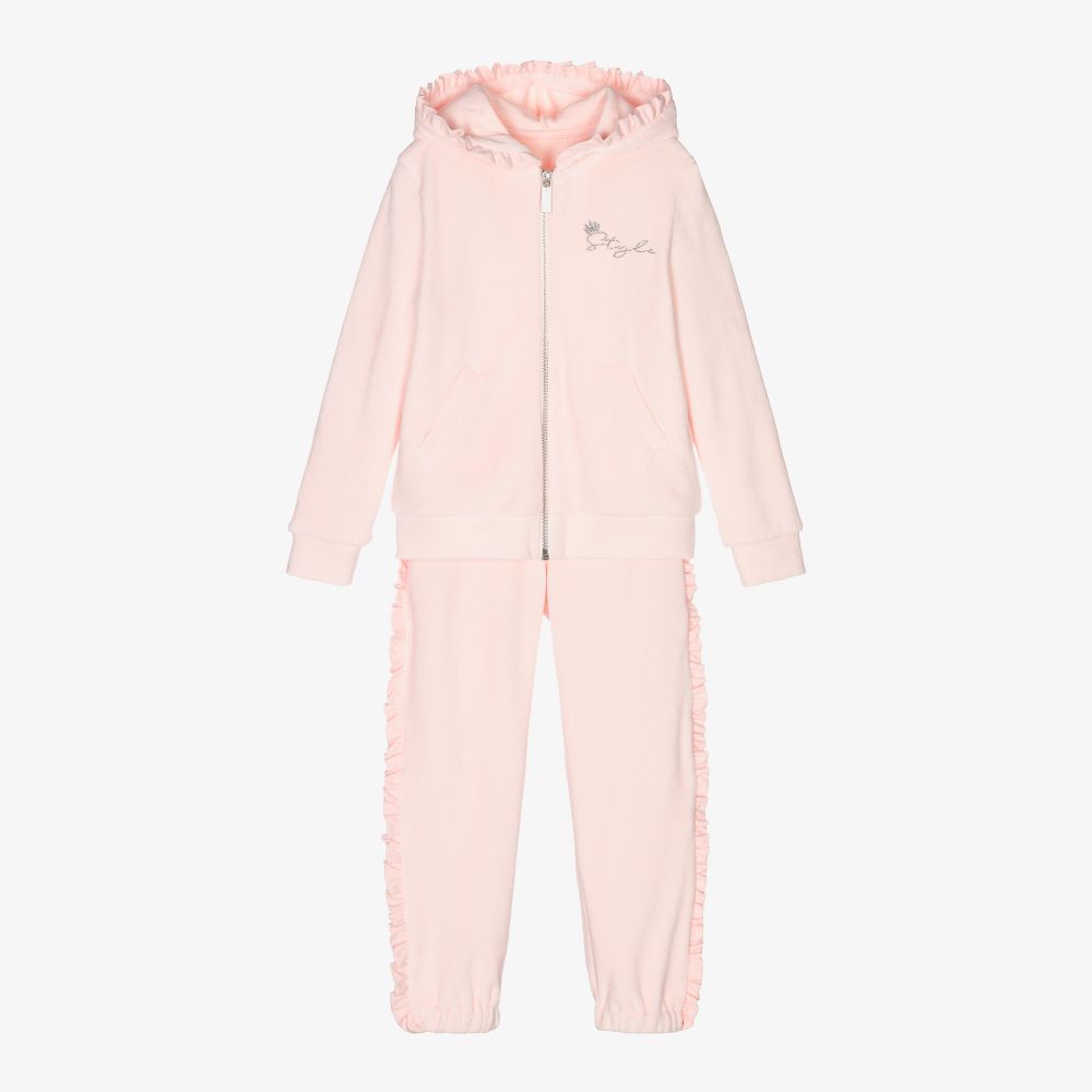 Pink tracksuit for girls from Lapin House, made from soft cotton velour with pretty ruffle trim. The hooded top has a silver branded zip fastening, a glittery silver 'Style' print and front pockets. The joggers have a gently elasticated waistband and ankle cuffs.