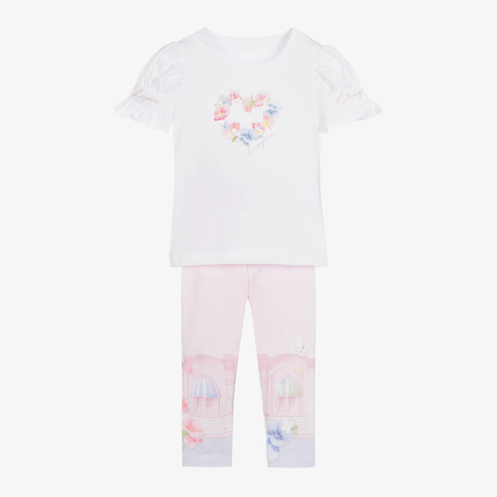 Pretty pink and white leggings set for girls by Lapin House, made in soft and stretchy cotton jersey. The white T-shirt has white grosgrain ribbon trims on the sleeves, with glittery pink and white logos. There is a colourful heart-shaped floral print on the front, with a matching logo. The leggings have a striking windows print with pretty pastel-coloured canopies, flowers and butterflies and a comfortable elasticated waist.