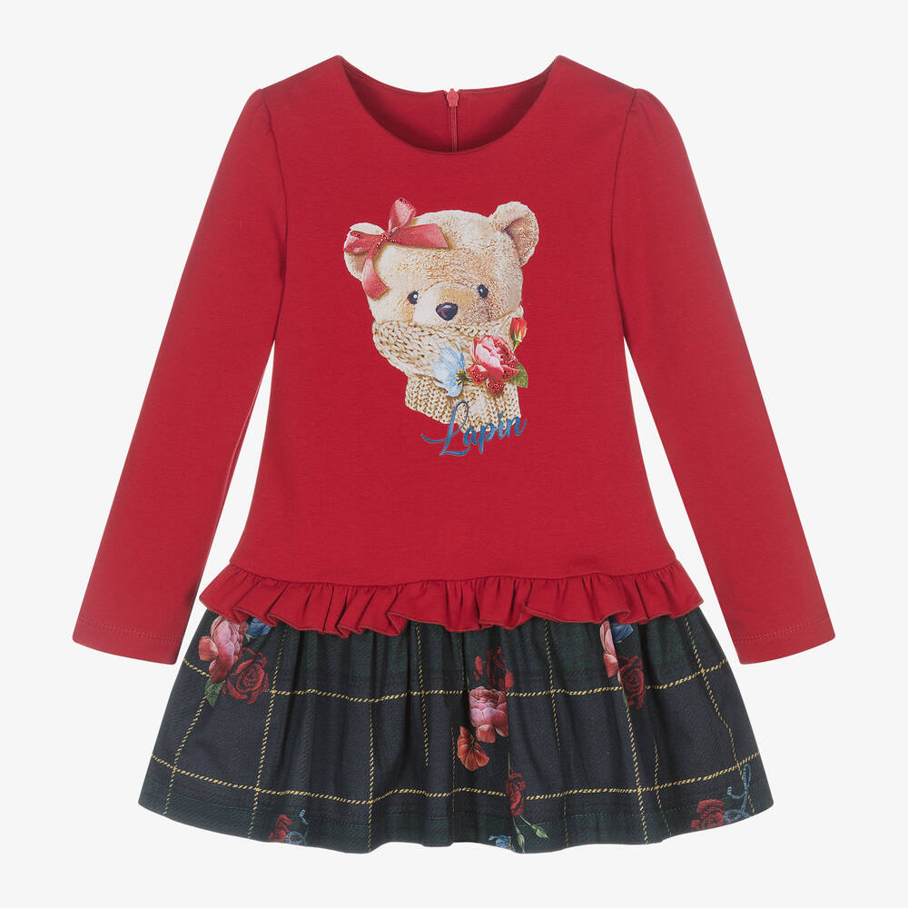 Cute cotton dress for girls by Lapin House, with a bear and flowers printed on the front, sparkling with red rhinestones. The red jersey bodice has a cosy, fleecy inside, a frill around the dropped waist and a neat, concealed zip on the back. The gathered, blue and green poplin skirt has a tartan print with pretty pink, red and blue roses.