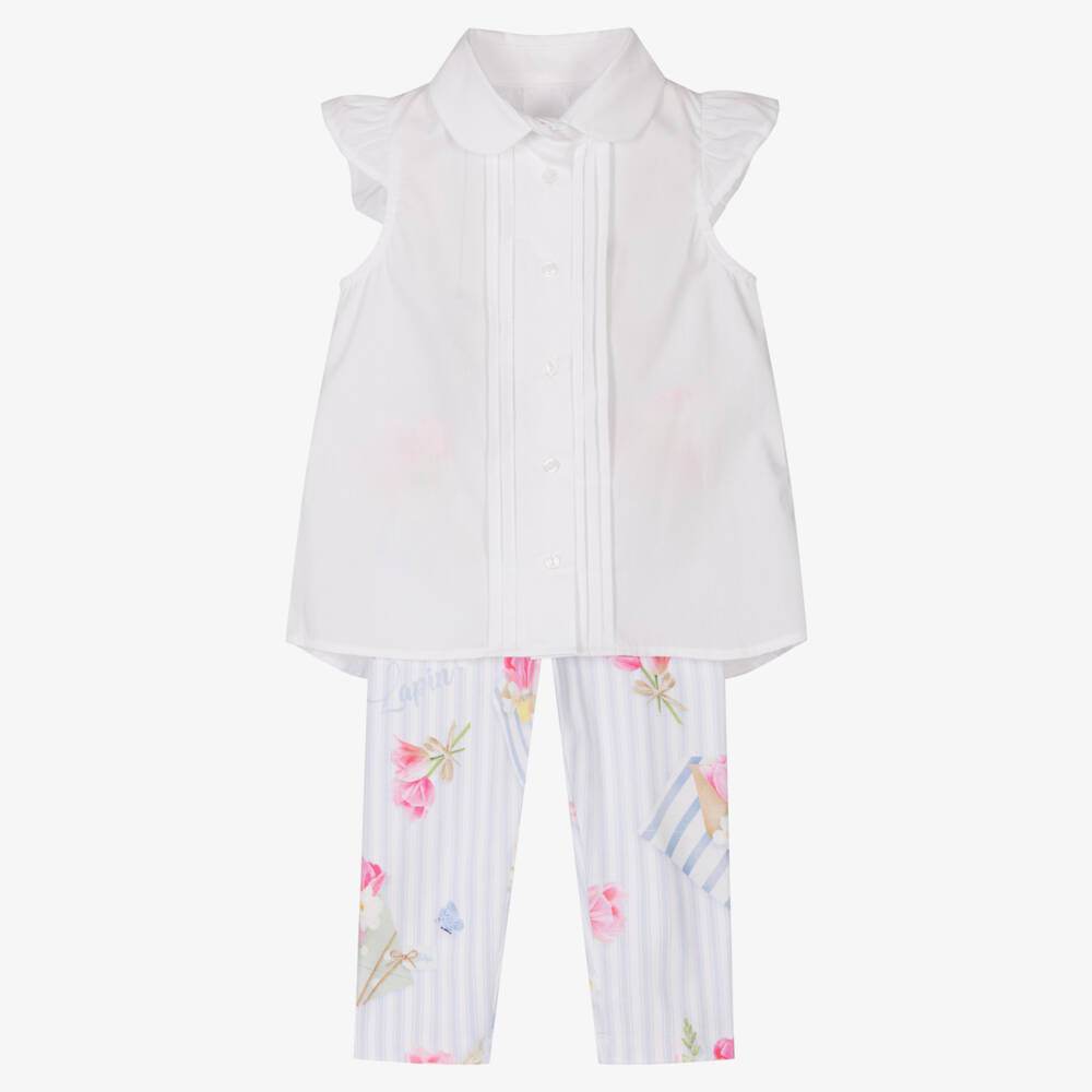 A charming two piece cotton leggings set for girls by Lapin House. Made in soft poplin, the pretty white blouse has capped ruffle sleeves, pintucks on the front, and lovely broderie anglaise detailing on the back. Soft and stretchy, the cropped jersey leggings are beautifully patterned in pale blue and white stripes, with colourful flowers. The sleeveless blouse fastens with buttons on the front and the leggings have a gently elasticated waist.
