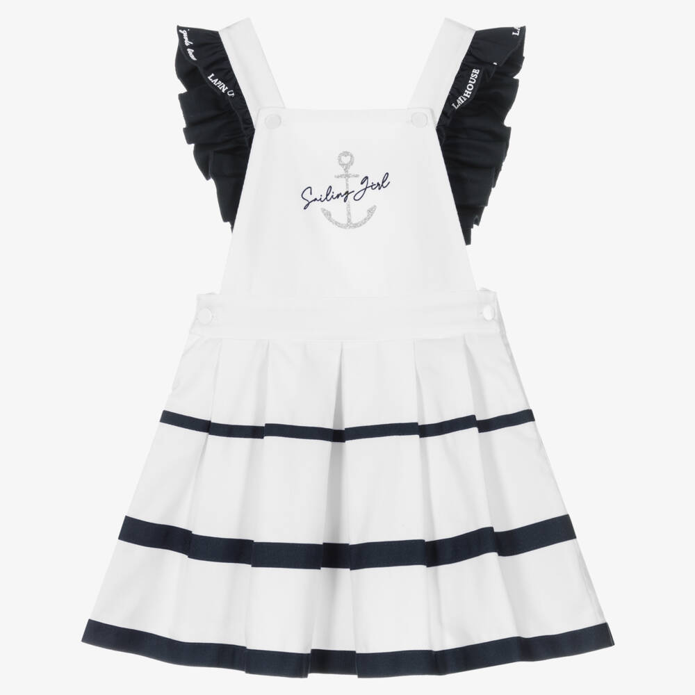 Pretty white pinafore dress for little girls by Lapin House, woven in lightweight cotton. Printed with a sparkly silver anchor on the bodice, this nautical-inspired dress has gorgeous flutter trims on the straps with sparkly logo details. Fastening with buttons, it has a cute blue and white striped skirt with smart pleats for a traditional look. A large blue bow is stitched on the back to complete this lovely design.