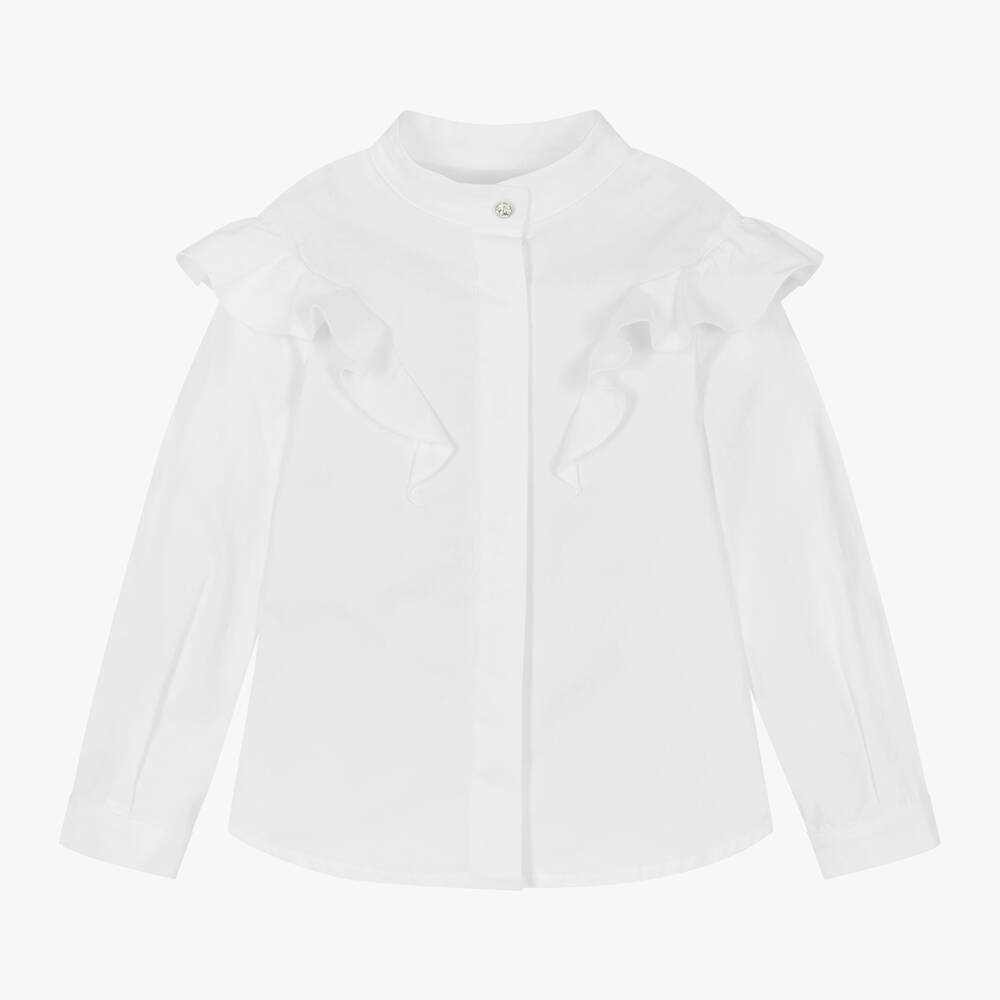 A lovely white blouse for girls by Lapin House, made in soft and lightweight cotton fabric. This collarless style has long sleeves and ruffled trims for pretty detail. The buttoned placket is neatly concealed and the hem is curved for a more casual look. It has a sparkly crystal-effect top button and identical fasteners on the cuffs.