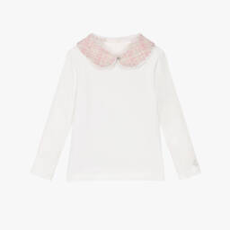 Off-white long-sleeved top for girls by Lapin House, made in soft cotton jersey. This casual top has a removable pink and beige tweed collar woven with glittery silver threads for a smart look. This charming Peter Pan collar can be removed for versatile wear. A glittery silver logo is printed on one sleeve for a sparkly branded finish.