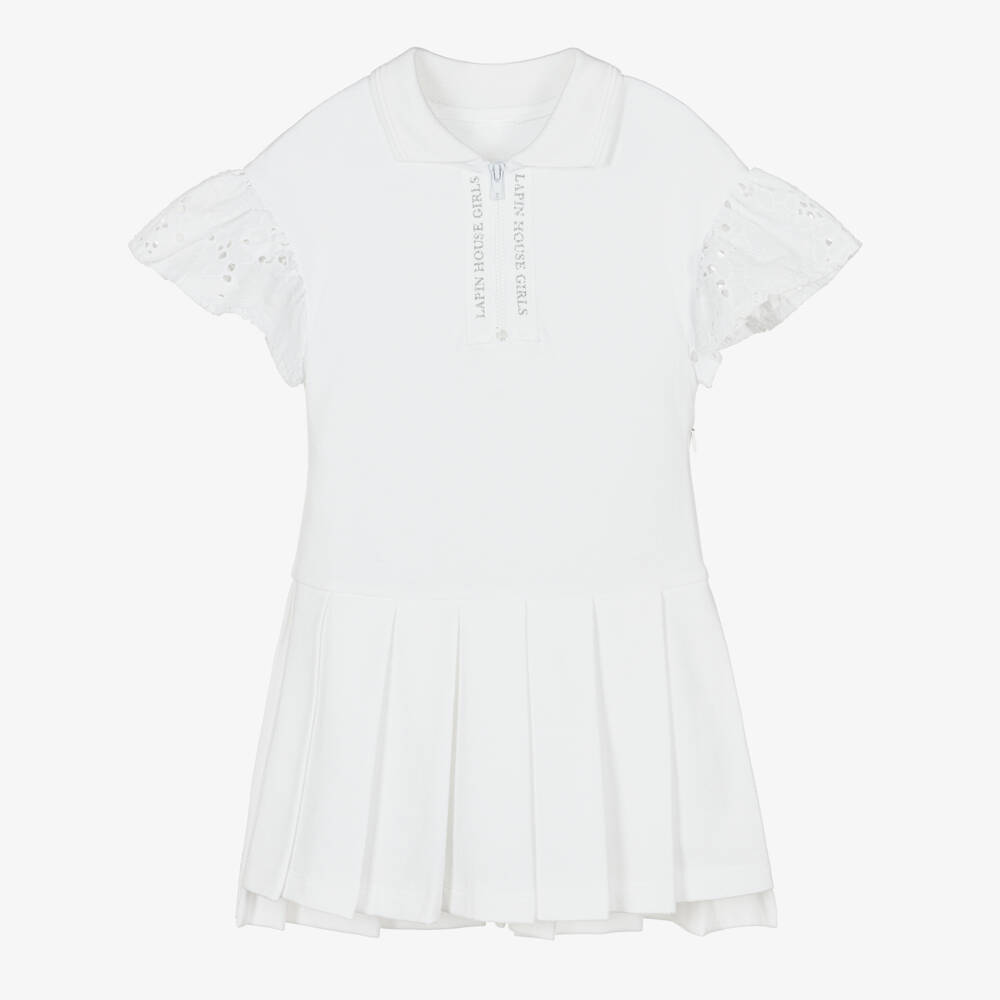 Pretty white tennis-style dress for girls from Lapin House, made in soft cotton piqué. The classic silhouette is created with a polo shirt collar and pleated skirt, whilst broderie anglaise sleeves accentuate the feminine finish. Silver glitter logo printed tape trims the half zip fastening and runs down the back of this comfortable dress. It has a useful side zip to help with dressing.