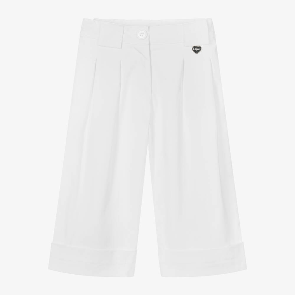 White culottes for girls by Lapin House, made in soft cotton twill. With a stylish wide-leg and turned up cuffs, these smart trousers are pleated on the front, with a silver-tone logo charm adding a subtle designer touch. They fasten with a button and zip and have an adjustable waistband for a comfortable fit.
