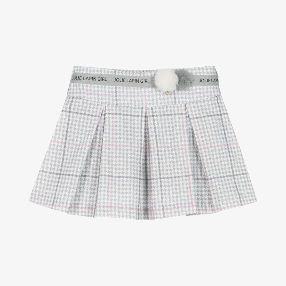 White skirt for girls by Lapin House, made in soft and mid-weight cotton, with a slight stretch. It has a light grey houndstooth pattern with contrast dark grey and pink stripes. The adjustable waistband has a grey 'Jolie Lapin Girl' tape around the front, with white and grey faux fur trims and a sparkly heart charm. This cute skirt is pleated, with a lightweight cotton lining and zip fastening on the side.