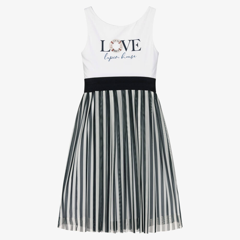Beautiful white sleeveless dress for girls by Lapin House. The cotton jersey bodice is comfortable and has a nautical-themed logo print on the front. The back has an alternative cut-out finish as the top is tied together in a bow. The skirt has a navy blue and white striped tulle overlay with a navy blue elasticated waistband and a soft cotton voile lining for comfort.