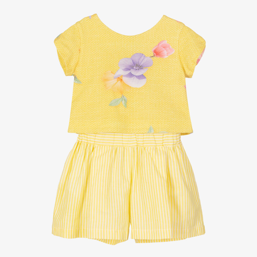 Sweet yellow shorts set for girls from Lapin House. The top is made in soft and stretchy cotton piqué, with a delicate flower and cute parrot print decorating the front and back. It has lovely tulip sleeves and a feminine wrap-around detail with button fastenings on the back. The shorts are woven in soft and lightweight Oxford cotton, with a softly elasticated waist, gentle on little tummies.
