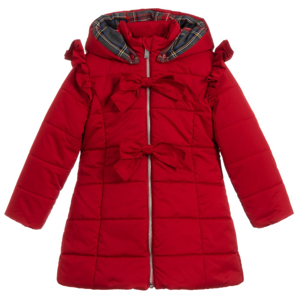 Girls red coat from Lapin House, with grey tartan check trim. It is made in silky-soft tactel, with a quilted cotton tartan lining and warm padding. It has removable bows over the front zip and a removable hood with button fastenings. There are pretty ruffles on the shoulders and side pockets, with adjustable waist toggles.