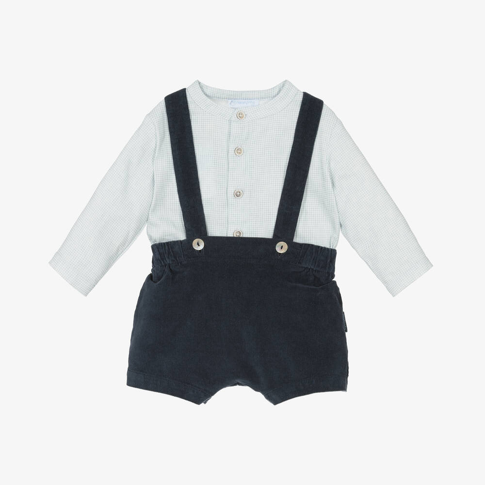 Sweet cotton shorts set for baby boys by Portuguese brand Laranjinha. The collarless, white and pale blue checked shirt fastens with buttons on the front and cuffs. The navy blue needlecord shorts have an elasticated waistband for comfort and adjustable shoulder straps that fasten with branded, mother-of-pearl buttons. Both pieces have a logo tab for a subtle designer finish.