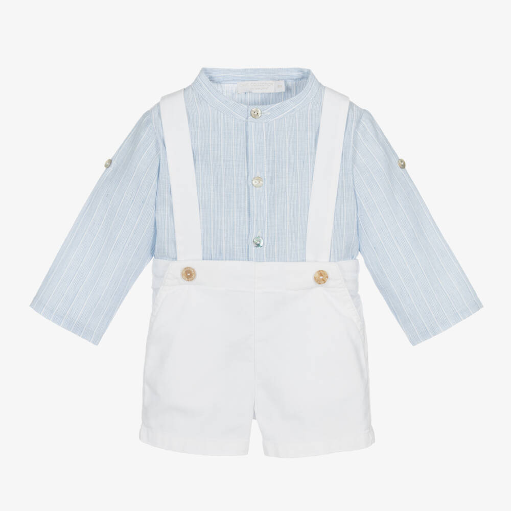 In pale blue and white, a smart-casual shorts set for baby boys by Laranjinha. Made in a soft cotton and linen blend, the striped collarless shirt has a half button placket on the front, with a useful button tab on the long sleeves for easy turn up. The piqué textured shorts are woven in soft cotton, with a hint of stretch for comfort. They have slanted front pockets and come with detachable braces which fix onto the partly elasticated waist with buttons.