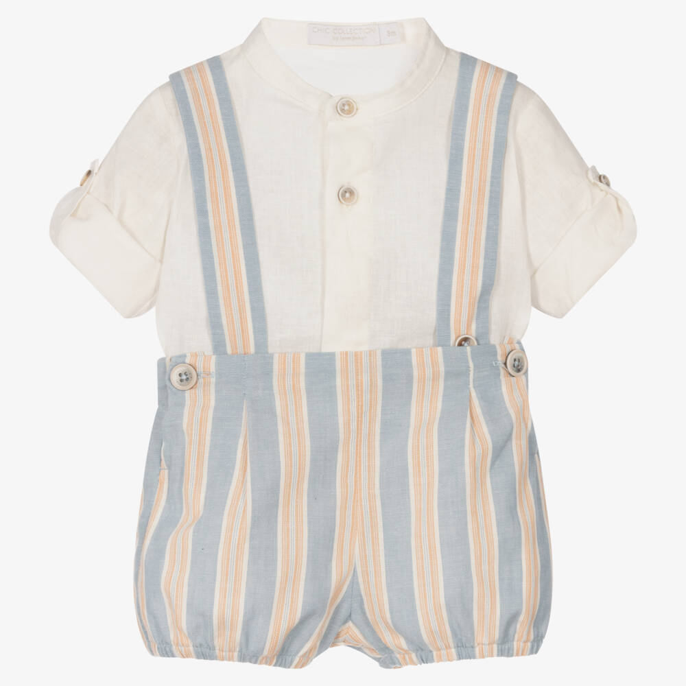Charming ivory and blue shorts set by Laranjinha, traditionally styled for baby boys. The blue, orange and ivory striped shorts are made in soft cotton and fully lined. Versatile and cute, they come with removable and adjustable straps, fastening with buttons on the gently elasticated waistband. The linen and cotton blend, shirt style bodysuit fastens with easy poppers on the cotton jersey legs, so it stay tucked in when worn. In a classic collarless styling, the front fastens with accent buttons and the sleeves can be worn long or rolled up for different looks.