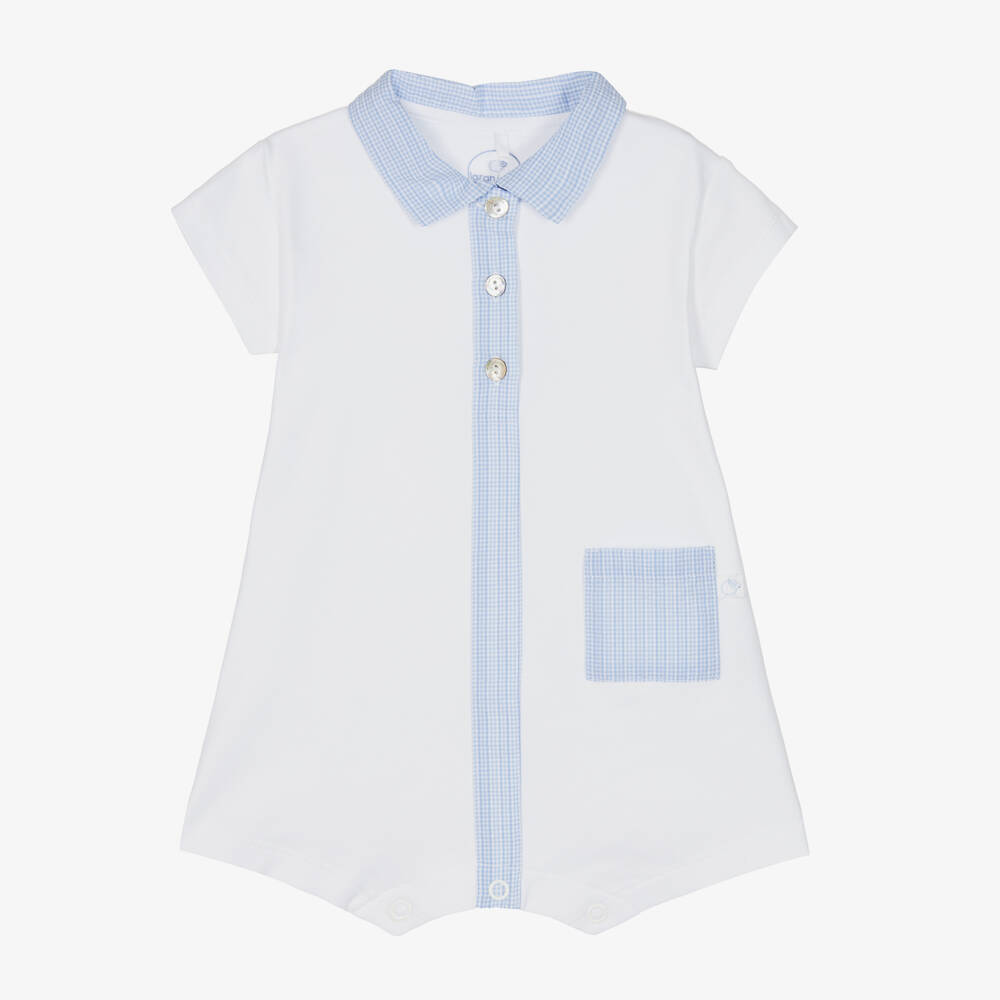 Charming white shortie for baby boys by Portuguese brand Laranjinha. Made in cotton jersey, it is soft against delicate skin and has easy-to-use popper fastenings between the legs for easier dressing and changes. A classic blue check seersucker fabric is used for the collar, pouch pocket and trim on the front for a sweet contrast. Branded mother-of-pearl button fastenings on the front give a subtle designer touch with a traditional finish.
