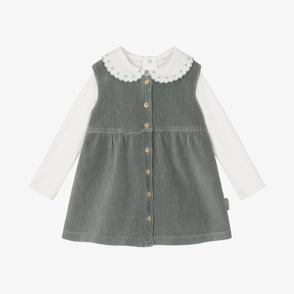 Sweet cotton dress set for baby girls by Portuguese brand Laranjinha. The comfortable, white jersey bodysuit has a pretty, scalloped, twill collar with green floral embroidery. It has a cosy, fleecy inside and fastens on the back and between the legs with poppers, so always remains neat and tidy. The soft, petrol blue, jumbo-cord dress is sleeveless, and fastens on the front with branded, wooden buttons.