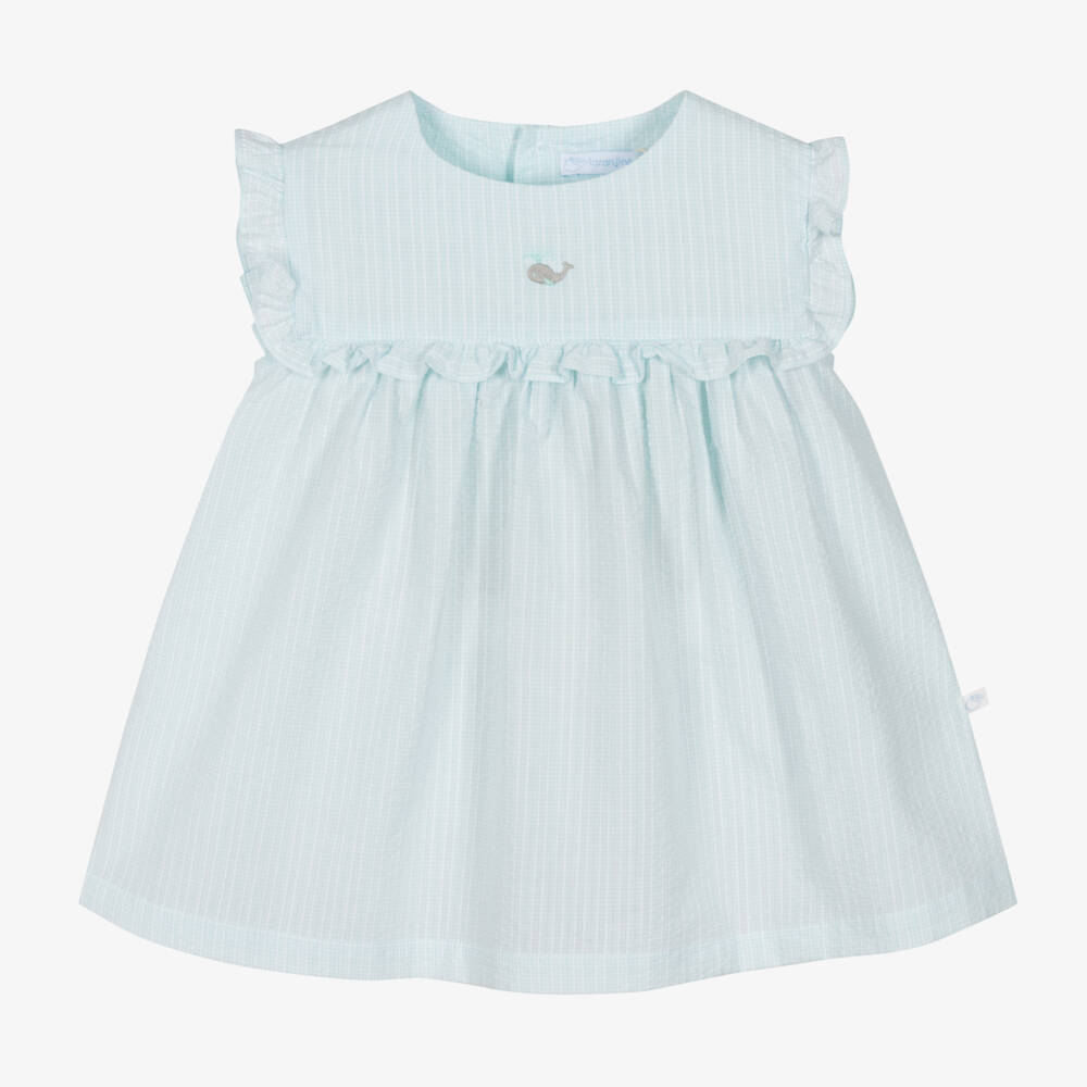 Lovely pale blue dress for baby girls from Portuguese brand Laranjinha, made in lightweight cotton seersucker. With iridescent button fastenings on the back for easier dressing, this sweet little dress has a small whale embroidery on the chest.