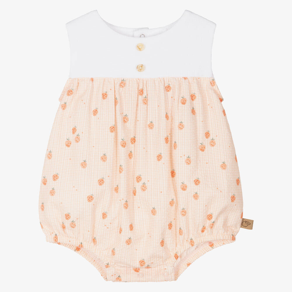 Cute cotton shortie for baby girls by Laranjinha, with a sweet strawberry print. The white jersey bodice has a waffle texture with decorative buttons, whilst the orange gingham lower part is made in summery seersucker.
