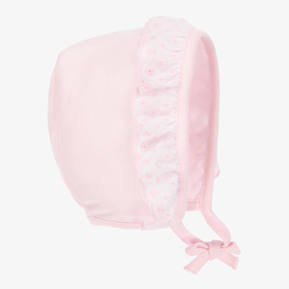 Soft and comfortable for baby girls, this pretty pale pink bonnet is by Laranjinha. Made in stretchy cotton jersey, it has a white and pink scalloped broderie anglaise ruffle trim. It secures under the chin with ties.