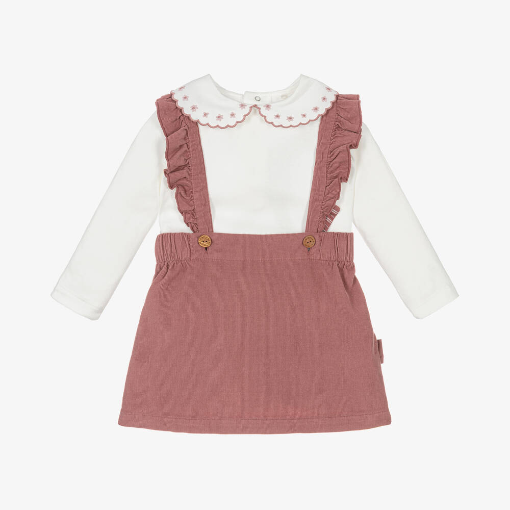 Cute cotton skirt set for baby girls by Portuguese brand Laranjinha. The comfortable, white jersey bodysuit has a pretty, scalloped, twill collar with pink floral embroidery. It has a cosy, fleecy inside and fastens on the back and between the legs with poppers, so always remains neat and tidy. The dusky pink needlecord skirt has an elasticated waistband for a comfortable fit and adjustable shoulder straps that fasten with branded, wooden buttons. Both pieces have a logo tab for a subtle designer finish.