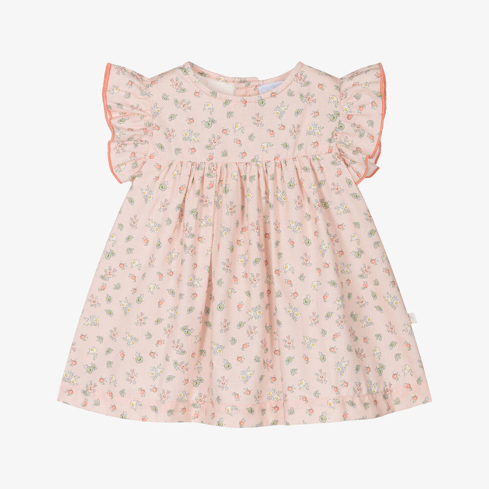 Pretty pink cotton dress for baby girls by Laranjinha, with a colourful floral print. Soft and lightweight, it has sweet ruffles over the shoulders and iridescent mother-of-pearl button fastenings on the back.