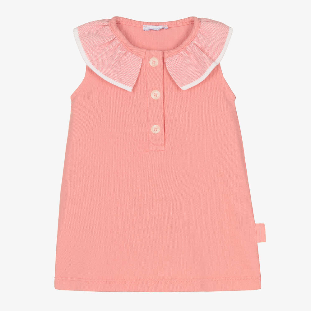Adorable pink dress for baby girls from Portuguese brand Laranjinha, made in soft cotton piqué. This sweet sleeveless dress is a modern twist on a classic polo with an oversized round collar and button fastenings on the front.