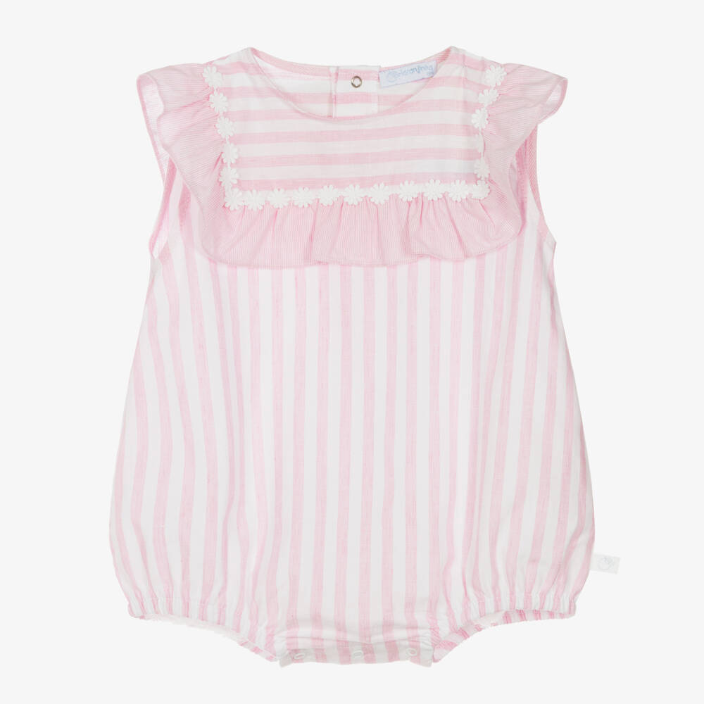Pretty pink and white striped shortie for baby girls by Laranjinha, made in a lightweight cotton and linen blend. Cool and comfortable, it has a ruffle trim in a delicate pink and white pinstripe, with sweet white floral appliqués on the front. There are popper fastenings on the back and between the gently elasticated leg cuffs.