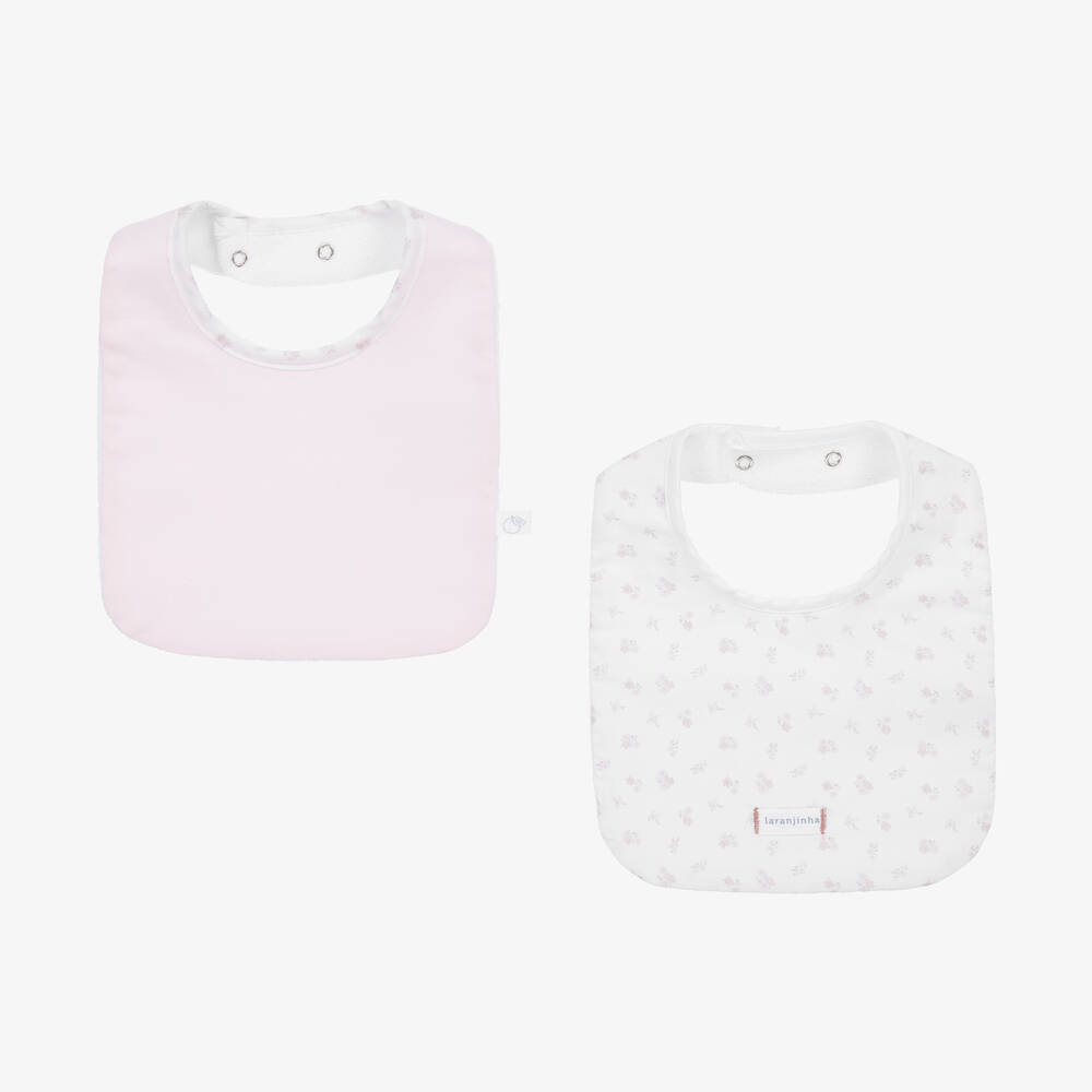 Pack of two cotton bibs for baby girls by Portuguese brand Laranjinha, in white and pink. One bib has a lightweight cotton front with pink floral prints and a logo tab, whilst the other is plain pale pink jersey. Both have an absorbent towelling lining with a PVC backing for extra protection, and fasten with adjustable poppers.