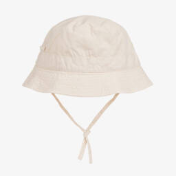 Little boys and girls will be stylish and protected from the sun with this beige bucket hat by Laranjinha. Fastening securely with ties beneath the chin, this practical summer accessory is made and lined in soft cotton. A small logo tab adds a subtle designer finish.