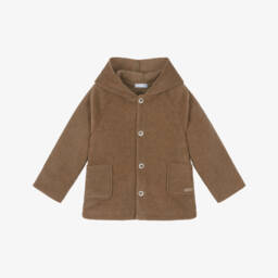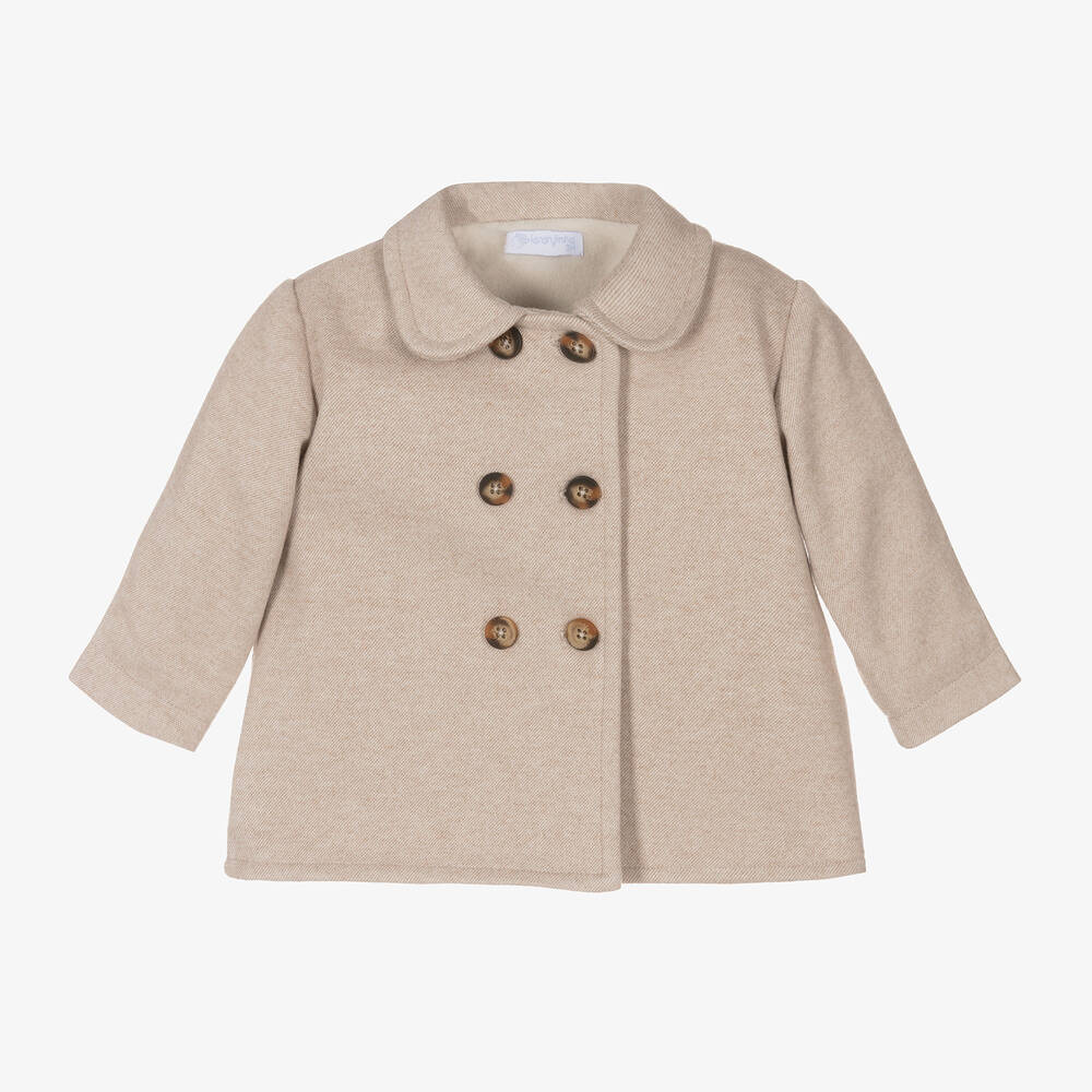 A charming beige jacket for little boys and girls by Laranjinha, made from a super soft brushed twill. In a smart double-breasted style, it has a sweet collar and brown branded button fastenings. It is lined in cosy fleece for added warmth in cooler temperatures and is stitched with a logo patch on the back.
