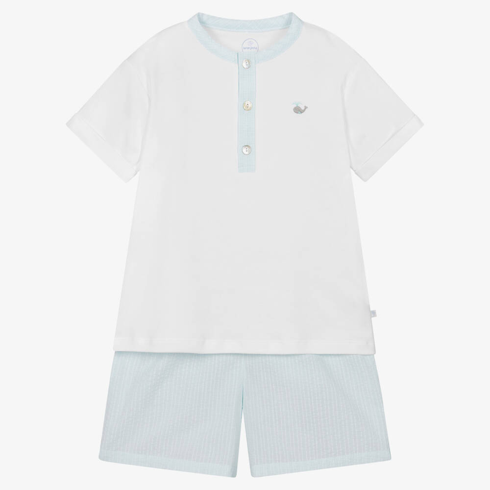 Aqua blue and white pyjamas for boys by Laranjinha, with a super soft cotton jersey T-shirt. A bedtime essential, this cosy shorts set includes a short-sleeved T-shirt with a blue gingham trim on the neckline and button placket. There is a small whale motif embroidered on the chest for a fun finish. In a lightweight weave, the matching shorts come in a coordinating gingham pattern to tie the two pieces together. They have an elasticated waistband for a comfortable night's sleep.